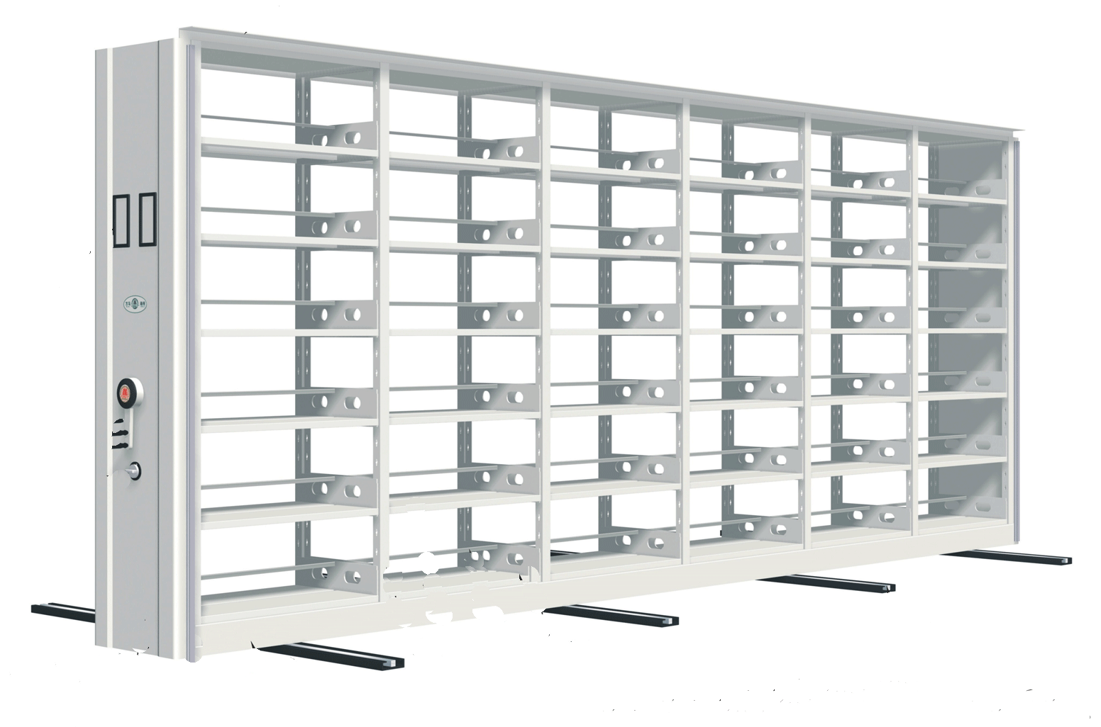 4、密集架各列之間裝有磁性吸力的橡膠密封條裝置,該密封條防老化處理。在架體頂部裝有防塵板,底部裝有防鼠檔,合攏后無空縫達到了防火、防塵、防盜防鼠、防光的要求。